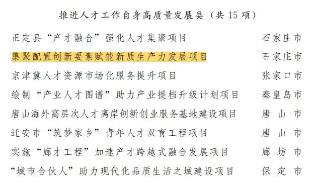 近日,河北省委人才工作領導小組辦公室發(fā)布《關于人才強冀工程2025年度重點人才項目立項的通知》,興冀人才公司申報的“集聚配置創(chuàng)新要素賦能新質生產力發(fā)展”項目獲得立項批復。